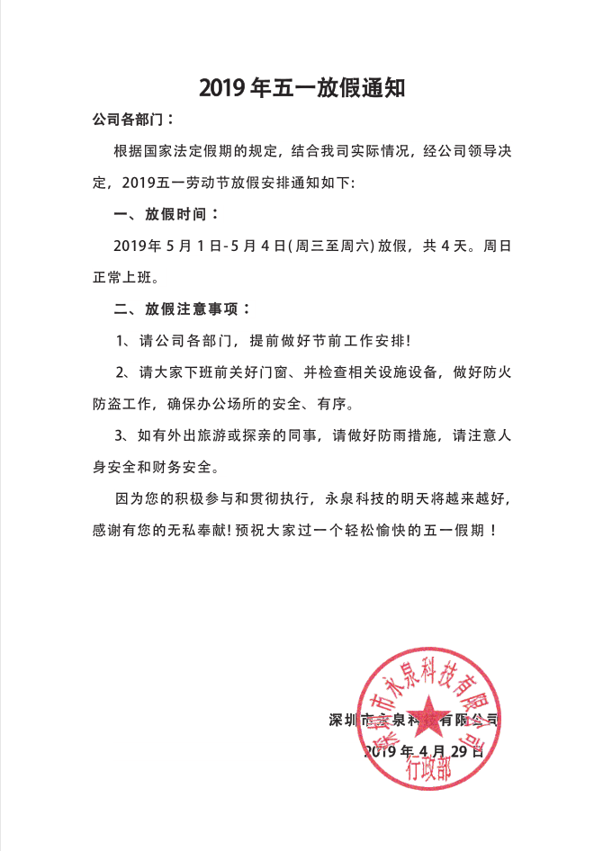 永泉科技2019年五一放假通知